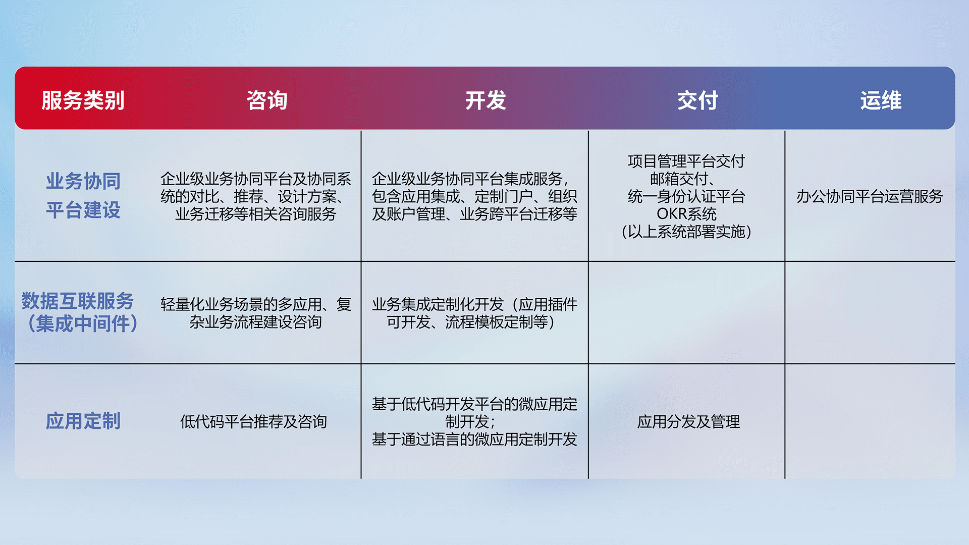 针对钉钉、、企微、、、、IDaas等平台级产品提供产品的规划、、、方案、、、交付、、定制化开发等服务,,,,实现如统一协同办公、、智能客户服务、、、、混合会议管理、、、、智能数据查询、、、、等业务场景,,,,实现数字化转型。。。。
