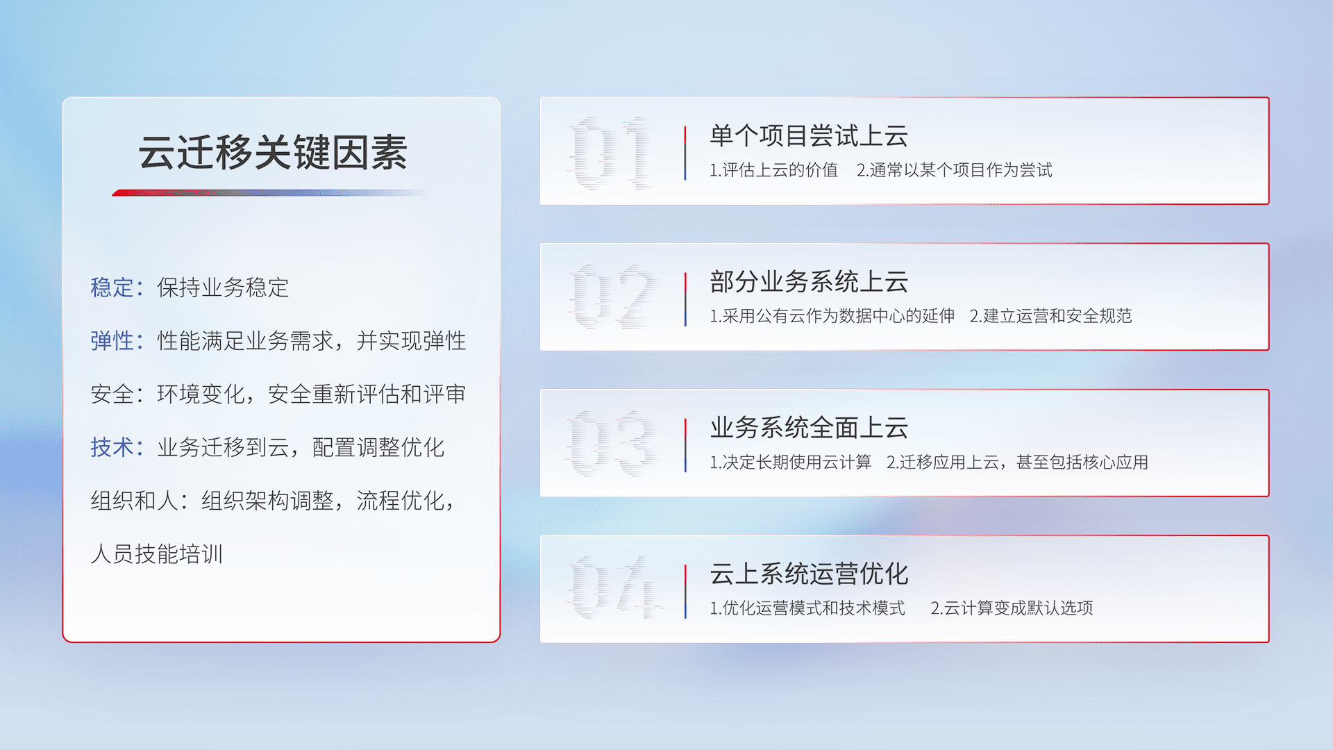 结合实际业务,,,从规划设计、、、云平台选型、、、云原生改造、、数据迁移、、、、集成交付,,,,迁移全过程为客户识别最佳上云路径,,,,做好风险识别管理,,设计网络架构、、、、身份权限、、、安全审计合规、、操作审计、、、日志审计、、、、监控告警策略、、多站点容灾设计等,,,,对云上基础设施进行整体规划,,提升IT治理水平,,以满足弹性、、、高可用、、、高性能的需求。。