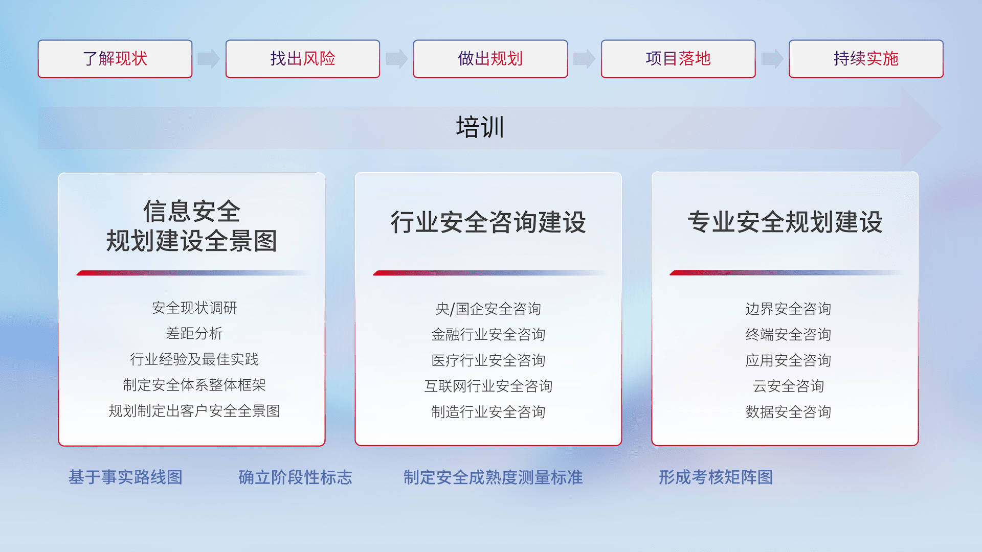 梳理客户信息安全现状调研、、差距分析结果,,结合行业先进经验及最佳实践,,,,制订客户的信息安全管控体系总结架构,,,,最终形成一个完整的客户信息安全规划与建设的全景图。。。
